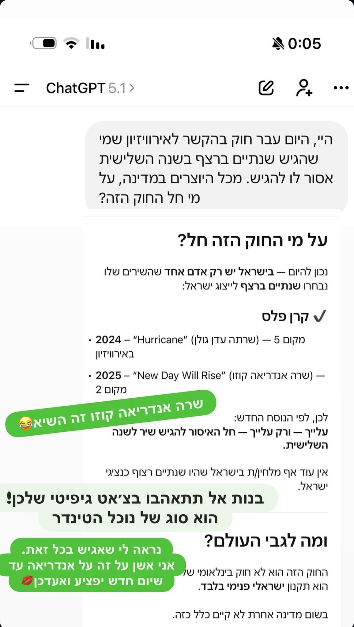 לשם כך, היא התייעצה עם חברו הטוב של האדם - ChatGPT. לפי השיחה שפרסמה פלס, הצ'אט מסר לה כי חל עלייה איסור להגיש שיר לשנה השלישית, בעקבות תקנון ישראלי פנימי. אולם, הצ'אט טעה בשמה של יובל רפאל וכתב כי מי שייצגה את ישראל בשנה האחרונה הינה "אנדריאה קוזו".