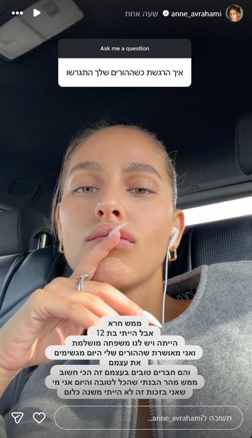 בסשן שאלות ותשובות שקיימה עם קהל העוקבים שלה באינסטגרם, כוכבת הריאליטי אן אברהמי התבקשה להתייחס לגירושים של הוריה: "הרגשתי ממש חרא, הייתה בת 12" | כל הפרטים