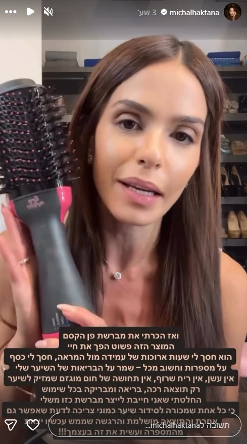 בעקבות השיתוף האישי, סיפרה הכוכבת הישראלית על מברשת פן מיוחדת שבה היא משתמשת, מוצר שאותו היא מקדמת ברשתות החברתיות. "המוצר הזה פשוט הפך את חייץ הוא חסך לי שעות ארוכות של עמידה מול המראה, חסך לי כסף על מספרות וחשוב מכל, הוא שמר על הבריאות של השיער שלי. אין עשן, אין ריח שרוף, אין תחושה של חום מוגזם שמזיק לשיער. רק תוצאה רכה, בריאה ומבריקה בכל שימוש. החלטתי שאני חייבת לייצר מברשת כזו משלי, כי כל אחת שמכורה לסידור שיער כמוני צריכה לדעת שאפשר גם אחרת והתוצאה מושלמת".