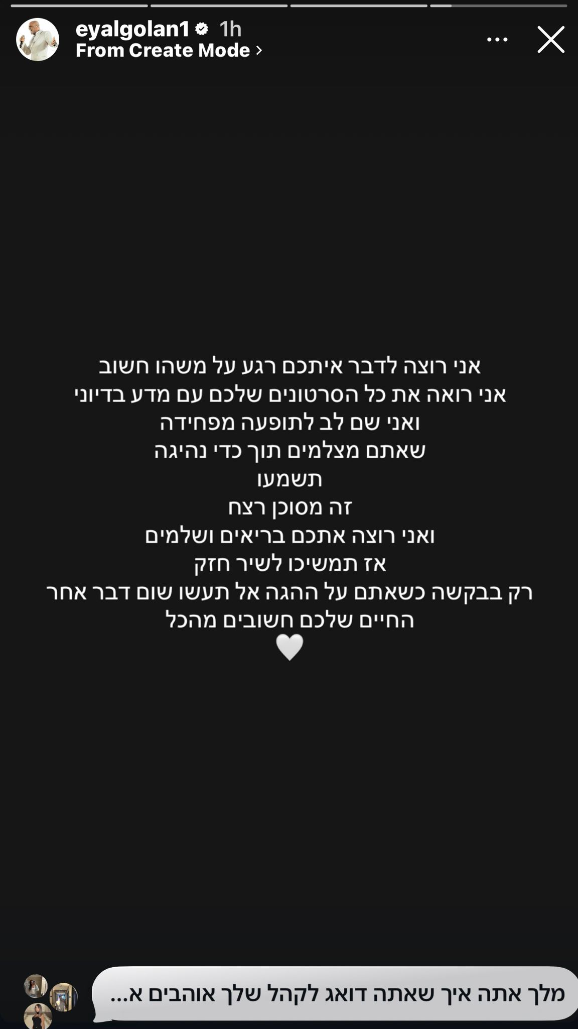 עוד הוסיף גולן: "אז תמשיכו לשיר חזק, רק בבקשה כשאתם על ההגה אל תעשו שום דבר אחר. החיים שלכם חשובים מהכל"; צפו בסטורי.