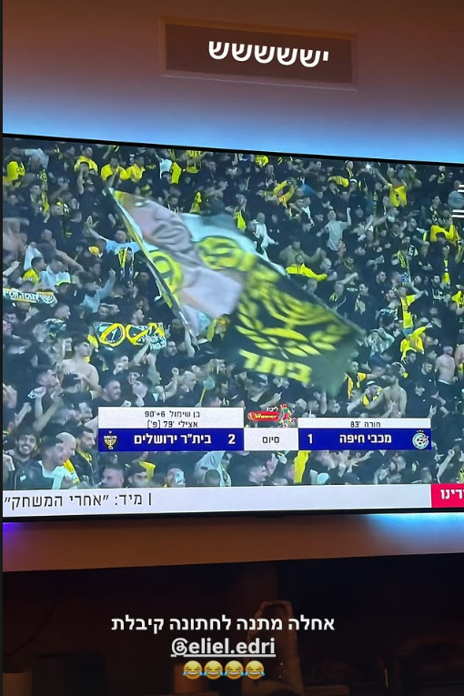 אמש (שני) בעקבות הניצחון של בית"ר ירושלים, קבוצתו האהודה של גולן, על מכבי חיפה, הזמר מצא דרך לחגוג את האירוע. "ישששש", כתב הזמר. "אחלה מתנה לחתונה קיבלת", רשם גולן, ותייג את הספר שלו וחברו הטוב אליאל אדרי, שאוהד את הקבוצה הנגדית.