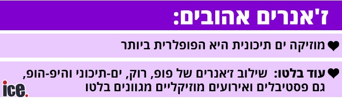 ז'אנרים אהובים: הגבולות בין הז'אנרים המוזיקליים ממשיכי להטשטש, כאשר בעוד המוזיקה הים תיכונית נותרה הקטגוריה המובילה, הצמיחה השנה מציגה כי הקהל הישראלי בוחר במופעים שנחשבים כשילוב בין מספר ז'אנרים שונים, כגון: פופ, רוק, ים-תיכוני והיפ-הופ על במה אחת. הקהל מצביע ברגליים גם לטובת פסטיבלים ואירועים המציעים חוויה מוזיקלית מגוונת.