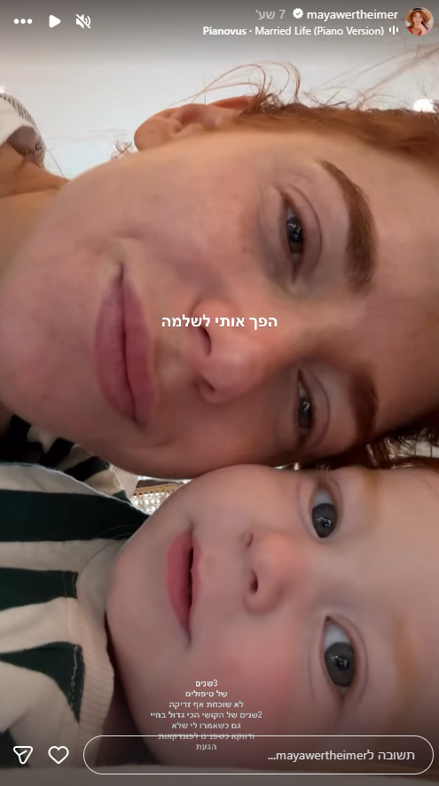 לצד סרטון מרגש שבו היא נראית מנשקת את בנה הפעוט, כתבה ורטהיימר: "הוא הפך אותי לשלמה. 3 שנים של טיפולים, לא שוכחת אף זריקה. שנתיים של הקושי הכי גדול בחיי. גם כשאמרו לי שלא ודווקא כשפנינו לפונדקאית, הגעת".