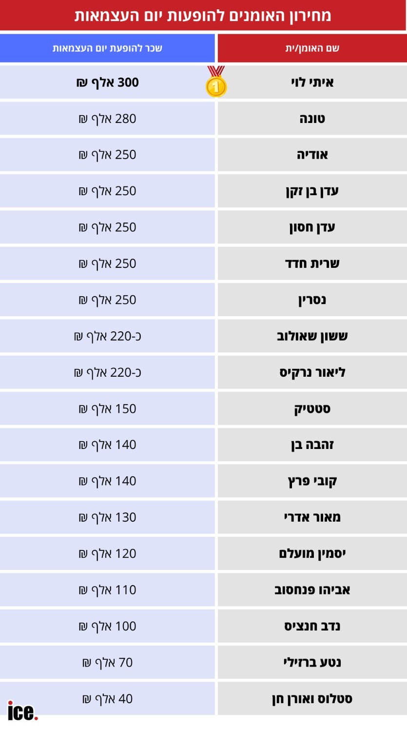 שכר האמנים ביום העצמאות נחשף - הדירוג המלא