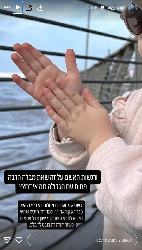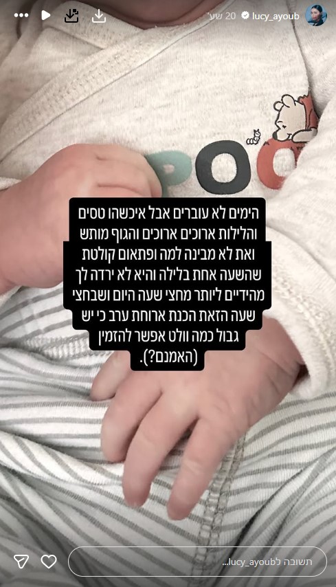 לצד האהבה החדשה שנכנסה לחייה, לוסי איוב שיתפה באתגרים הרבים שבחיי האימהות וברגשות שעוטפים אותה עם גידול התינוקת. בסדרת סטוריז שפרסמה בחשבון האינסטגרם שלה, כתבה השחקנית והמגישה: "הימים לא עוברים אבל איכשהו טסים. הלילות ארוכים ארוכים והגוף מותש ואת לא מבינה למה ופתאום קולטת שהשעה אחת בלילה, והיא לא ירדה לך מהידיים ליותר מחצי שעה היום, ושבחצי שעה הזאת הכנת ארוחת ערב כי יש גבול כמה וולט אפשר להזמין (האומנם?)".