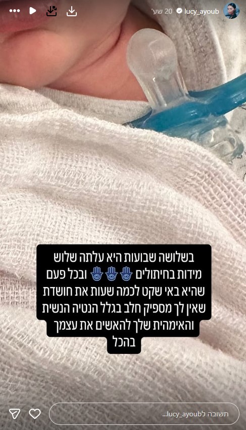 בסטורי נוסף שפרסמה, כתבה הכוכבת הישראלית: "בשלושה שבועות היא עלתה שלוש מידות בחיתולים ובכל פעם שהיא באי שקט לכמה שעות את חושדת שאין לך מספיק חלב בגלל הנטייה הנשית והאימהית שלך להאשים את עצמך בהכל. אז את בלופ. אבל את גם יודעת שתכף תחזרי לעבודה ותתגעגעי לזה ופתאום את נהיית נוסטלגית להווה וגם זה (כמו הכל) גורם לך לבכות".