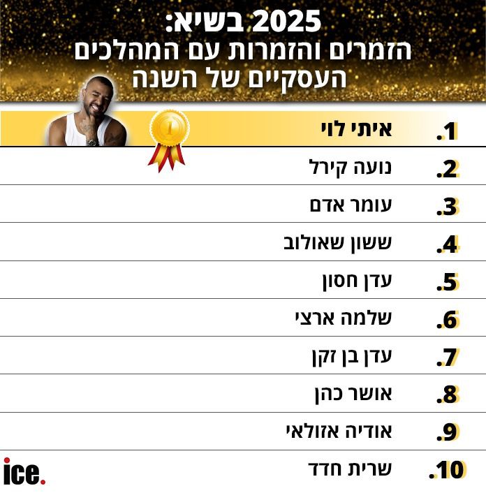 שנת 2025 הייתה מלאה בלא מעט מהלכים עסקיים של הזמרים הגדולים ביותר במדינה. לכבוד סיום השנה האזרחית ותחילתה של שנת 2026: זה דירוג ice למהלכים העסקיים הבולטים של הזמרים והזמרות לשנת 2025-2026