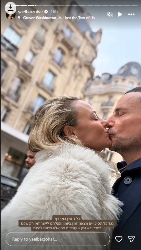 בהמשך, העלתה סטורי עם תמונה מתוקה של שניהם וכתבה: "הצלחנו למצוא כמה ימים בעיר היפה ביותר בעולם". לאחר מכן, העלתה תמונה שלה ושל זוארץ מתנשקים וכתבה ברקע: "כל הזמן במרדף. נגד כל הסיכויים מצאנו זמן ביומן והצלחנו לייצר זמן רק שלנו ביחד. לא זמן שעובדים פה אלא פשוט להיות".