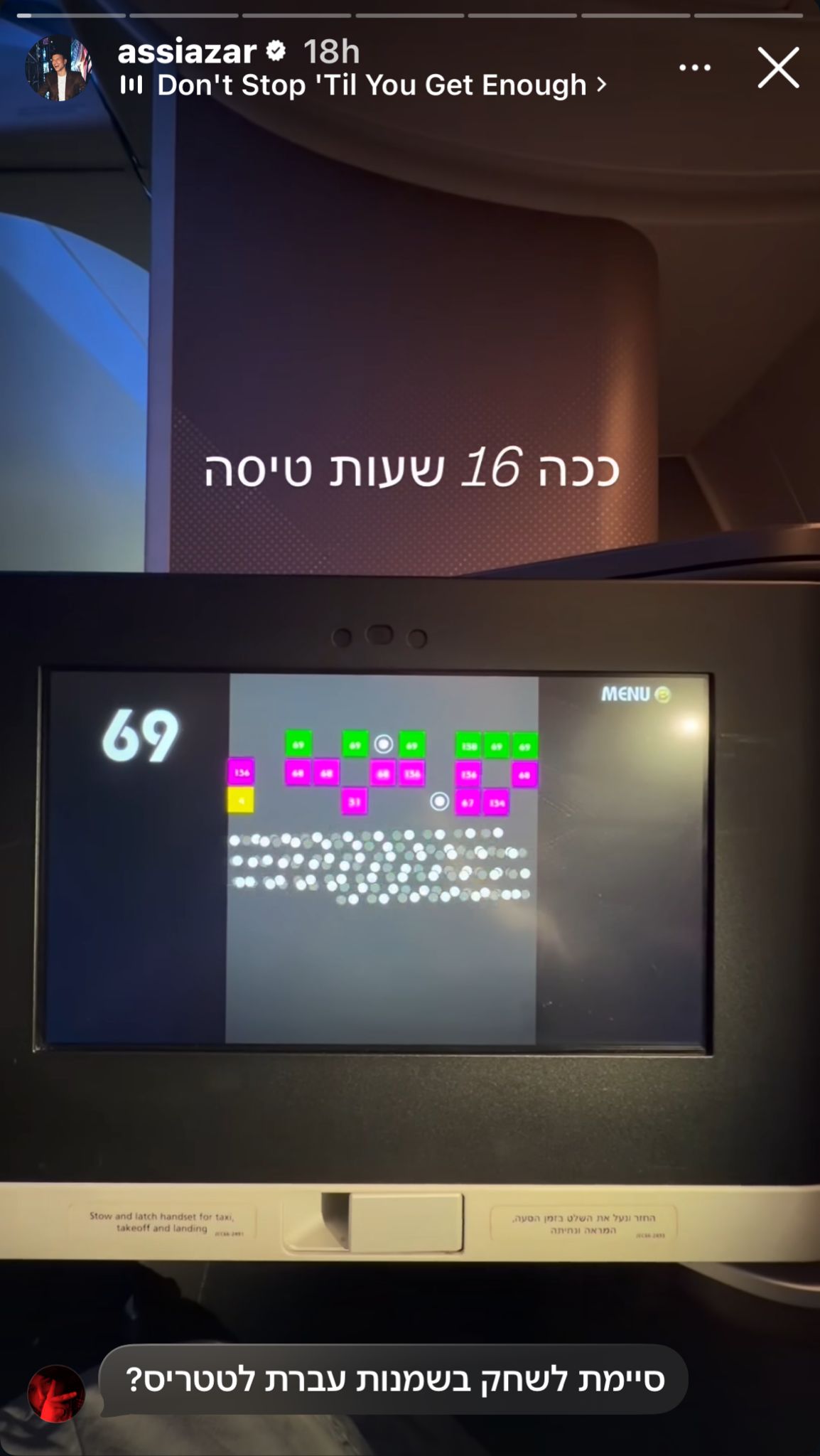 המנחה פרסם ברשתות החברתיות מספר תמונות שבהן הוא נראה משחק במערכת הבידור שבגב המושב במטוס, לצד הכיתוב "ככה 16 שעות טיסה". בתמונות נוספות שהעלה, חשף עזר את היעד שאליו טס.