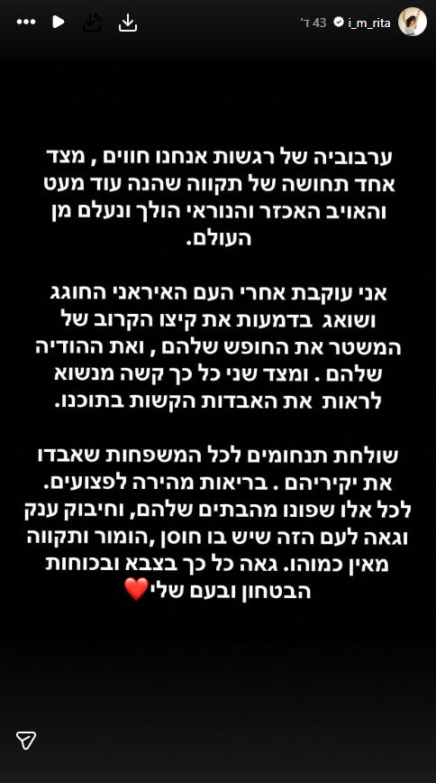 ברקע המתקפה המשולבת של ארצות הברית וישראל באיראן במסגרת מבצע "שאגת הארי", הזמרת ריטה הביעה את תחושותיה נוכח חיסול בכירי המשטר האיראני, זאת לצד האסון הנורא שהתרחש בבית שמש והוביל למותם של תשעה תושבים.