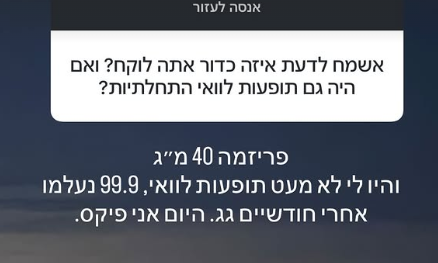 בהמשך, הוא שיתף במינון התרופות אותן הוא נוטל. "פריזמה 40 מ"ג, והיו לי לא מעט תופעות לוואי, 99.9% נעלמו אחרי חודשיים גג. היום אני פיקס".