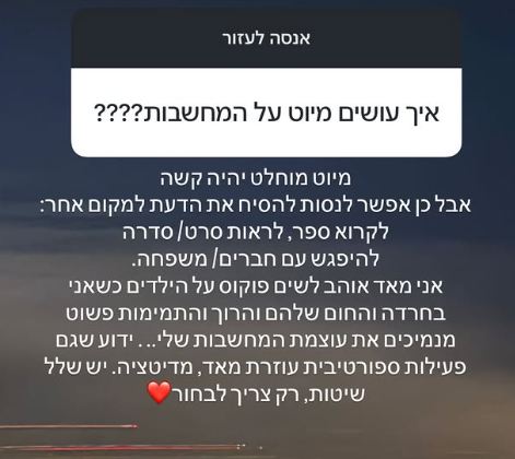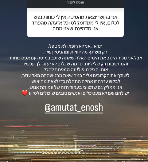 אחרת שיתפה כי היא בקושי 'יוצאת מהמיטה', 'אין לי כוחות נפש לכלום', המשיכה. "מכיר היטב את הימים האלה שאתה שוכב במיטה עם אפס כוחות", כתב לה עזר. "אותי הציל טיפול. זה המפתח להכל. לבקש עזרה זה אחלה התחלה כדי לצאת מהייאוש". עזר הציע גם להיעזר בעמותת "אנוש", הפועלת להעלאת המודעות לתחום בריאות הנפש.