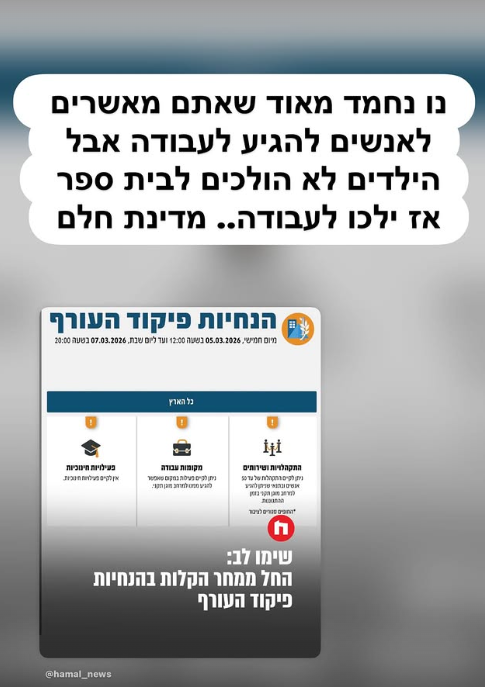 "נו נחמד מאוד שאתם מאשרים לאנשים להגיע לעבודה אבל הילדים לא הולכים לבית ספר. אז ילכו לעבודה.. מדינת חלם", כתב כוכב "המירוץ למיליון" והשחקן שלומי יפרח. הנחיות פיקוד העורף כאמור תקפות עד ליום שבת בערב, אז תינתנה הנחיות חדשות בהתאם להערכת המצב.
