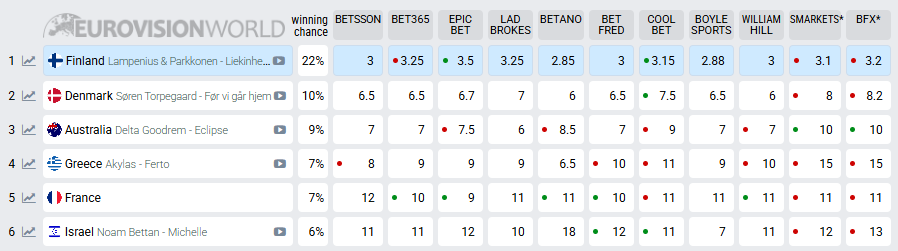 ומה המצב בטבלת ההימורים? בחודש ינואר, יממה לאחר שנועם בתן זכה ב-"כוכב הבא לאירוויזיון" ונבחר להיות הנציג הישראלי לתחרות, ישראל השקיפה מעל כולן שהיא תופסת את הפסגה. ערב לפני חשיפת השיר, נועם בתן ניצב במקום ה-6 עם 6% סיכויי לזכייה וכעת לאחר חשיפת השיר, המצב נותר על כנו.