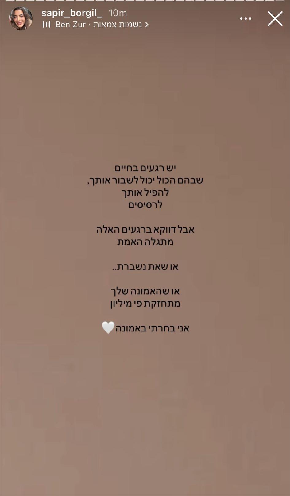 כעת, בורגיל מגיבה לראשונה: "יש רגעים בחיים, שבהם הכל יכול לשבור אותך, להפיל אותך לרסיסים. אבל דווקא ברגעים האלה מתגלה האמת - או שאת נשברת - או שהאמונה שלך מתחזקת פי מיליון. אני בחרתי באמונה".