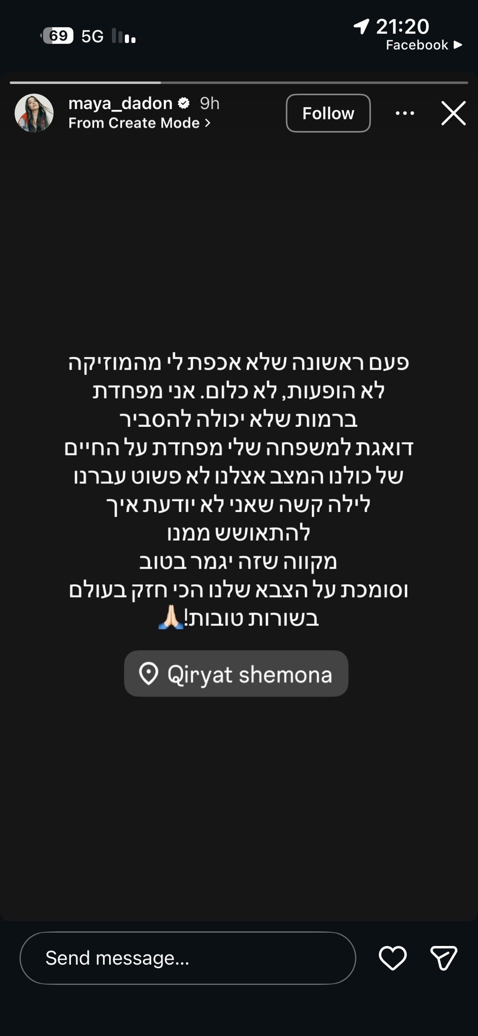 על התחושות והחוויה הלא נעימה מלילה האחרון של המבצע: "עברנו לילה קשה שאני לא יודעך להתאושש ממנו, מקווה שזה ייגמר בטוב". את הסטורי הבהירה כי סומכת על צה"ל שיחזיר את השקט לאיזור הצפון ואיחול לבשורות יותר חיוביות: "סומכת על הצבא שלנו, הכי חזק בעולם, בשורות טובות!".