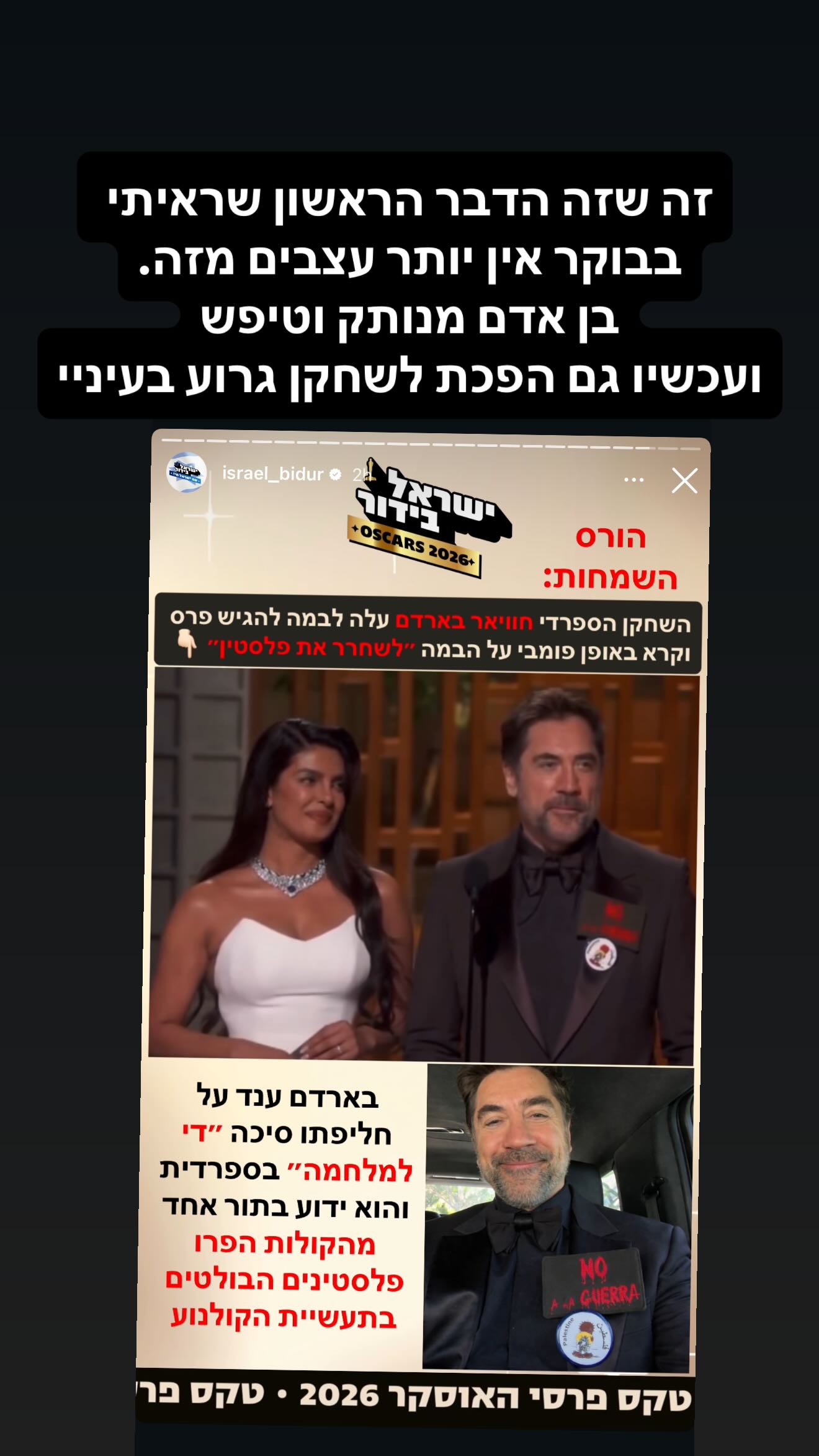 השחקן ההוליוודי חאבייר בארדם הגיש אמש (ראשון) את הפרס לסרט הבינלאומי הטוב ביותר במסגרת פרסי האוסקר. על חליפתו הוא ענד סיכות שהדהדו מסרים פרו-פלסטיניים ואנטי-ישראליים, והתראיין על כך בהמשך. בארדם יצא נגד פעולות צה"ל ברצועת עזה, וקבע כי מתקפות ישראל וארצות הברית על אדמת איראן מקורן בשקר.