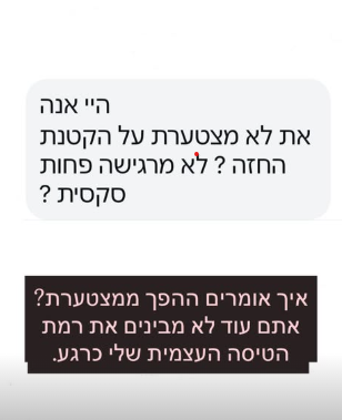 ארונוב נשאלה: "את לא מצטערת על הניתוח להקטנת חזה? לא מרגישה פחות סקסית?". ארונוב הגיבה בכנות: "איך אומרים ההפך ממצטערת? אתם עוד לא מבינים את רמת הטיסה העצמית שלי כרגע".