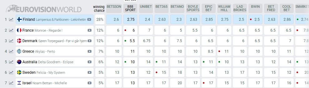 אז ב-2027 ניפגש בתל אביב? על פי המהמרים, בגזרת השיר המנצח המצב הוא קצת שונה. "Michelle" במקום השביעי עם 5% סיכויי לזכייה, במקום הראשון מעל כולן הוא השיר הפינלנדי, "Liekinheitin" עם 28% סיכויי לזכייה.