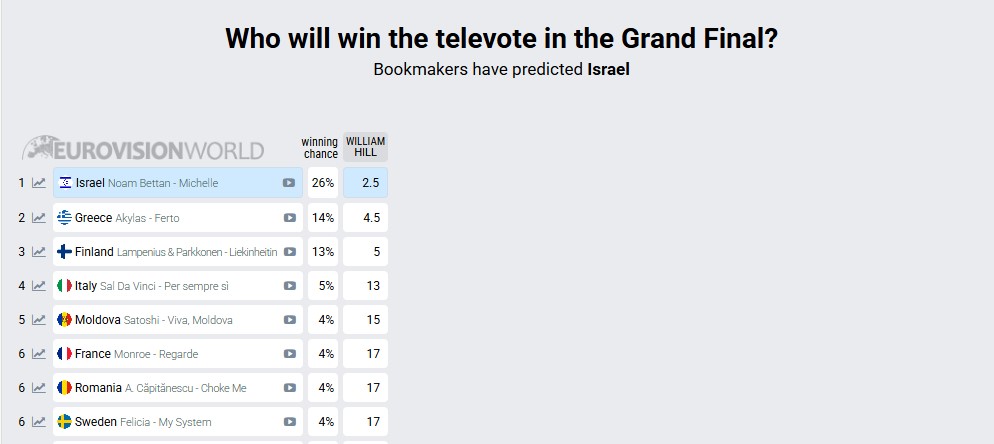 נכון לכתיבת שורות אלו, אתר ההימורים eurovisionworld מציג כי השיר הישראלי לאירוויזיון, "Michelle" ניצב במקום הראשון עם סיכוי של 26% לקבל את הכי הרבה הצבעות מהקהל בבית. נועם בתן ניצב לבד בפסגה כשבמקום השני, יוון עם השיר "Ferto" קיבל סיכוי של 14%.