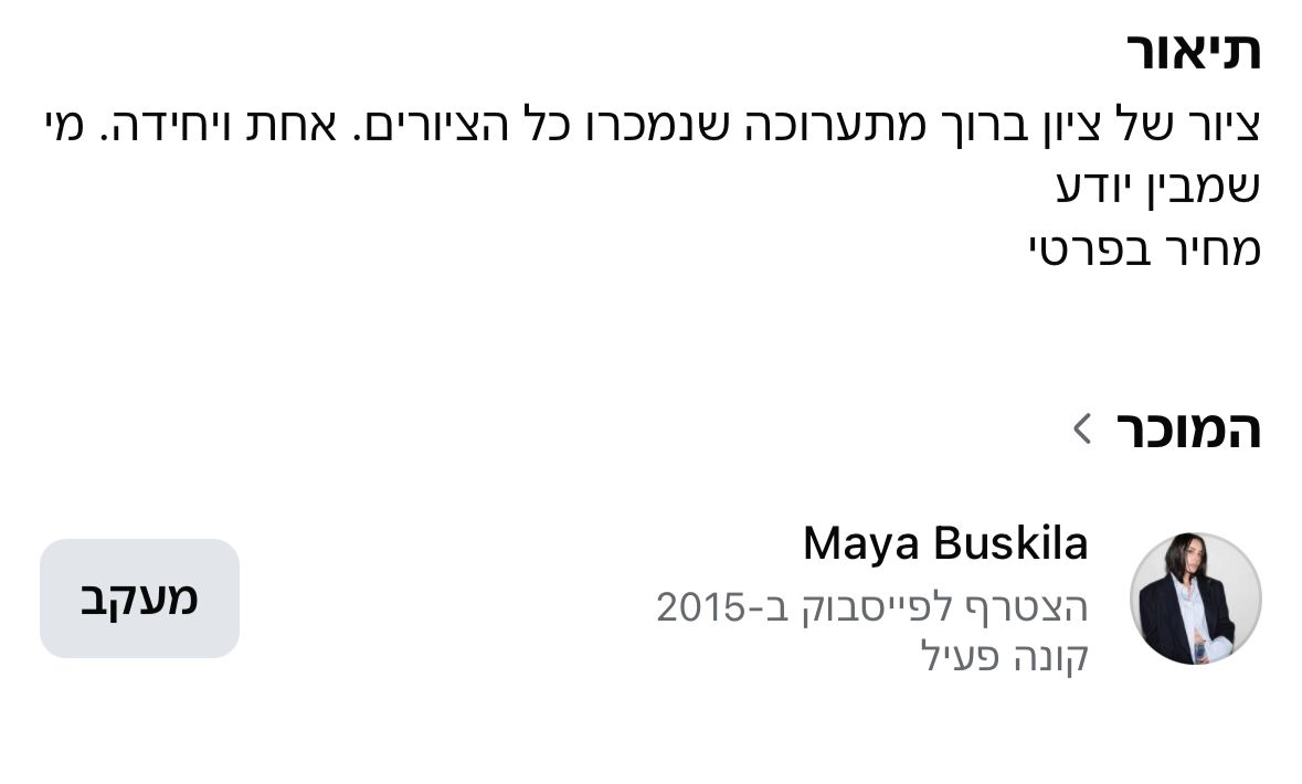 הזמרת מאיה בוסקילה פרסמה לאחרונה מודעה במרקט פלייס של הרשת החברתית פייסבוק והציגה תמונה של יצירת האומנות המדוברת וכתבה: "ציור של ציון ברוך מתערוכה שנמכרו ממנה כל הציורים. מי שמבין, יודע".
