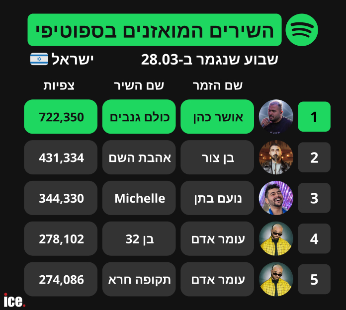 הקהל הישראלי אמר את דברו, והמצעד המקומי של ספוטיפיי לשבוע שהסתיים מציג שליטה מרשימה של אושר כהן. כהן כבש את המקום הראשון והמכובד בטבלת השירים המואזנים ביותר עם הלהיט "כולם גנבים", שגרף לא פחות מ-722,350 השמעות. הרחק מאחוריו, במקום השני, התייצב בן צור עם השיר "אהבת השם" שהאזינו לו 431,334 פעמים.
