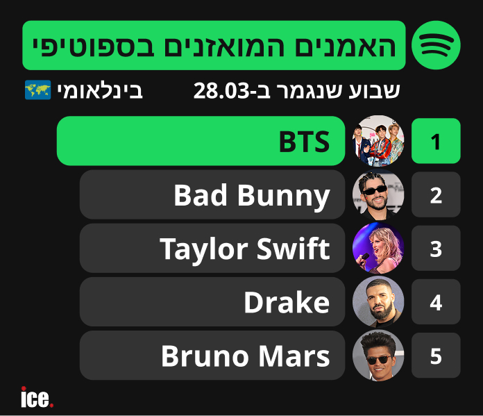 בהתאמה מוחלטת לטירוף ההשמעות בגזרת השירים, טבלת האמנים הבינלאומיים המואזנים ביותר בספוטיפיי נשלטת ביד רמה על ידי BTS, שקוטפת את המקום הראשון בעולם. את המקום השני תופס כוכב העל הלטיני Bad Bunny, ואחריו מתייצבת טיילור סוויפט (Taylor Swift) במקום השלישי. את החמישייה הפותחת של ענקי המוזיקה הבינלאומיים סוגרים הראפר דרייק (Drake) במקום הרביעי, והזמר ברונו מארס (Bruno Mars) שמתמקם במקום החמישי והמכובד.