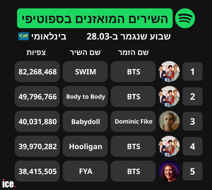 כשעוברים לזירה הבינלאומית, המספרים מזנקים לשמיים והשליטה של הלהקה BTS פשוט מוחלטת. ההרכב תופס לא פחות מארבעה מקומות מתוך החמישייה הפותחת של השירים המואזנים ביותר בעולם. במקום הראשון ניצב הלהיט "SWIM" של הלהקה עם נתון פסיכי של 82,268,468 השמעות. מיד אחריו, במקום השני, השיר "Body to Body", גם הוא של BTS, עם 49,796,766 השמעות. במקום השלישי הוא Dominic Fike עם השיר "Babydoll" שצבר 40,031,880 השמעות. במקום הרביעי והחמישי שוב מככבת BTS עם השירים "Hooligan" שרשם 39,970,282 השמעות, ו-"FYA" שצבר 38,415,505 השמעות.