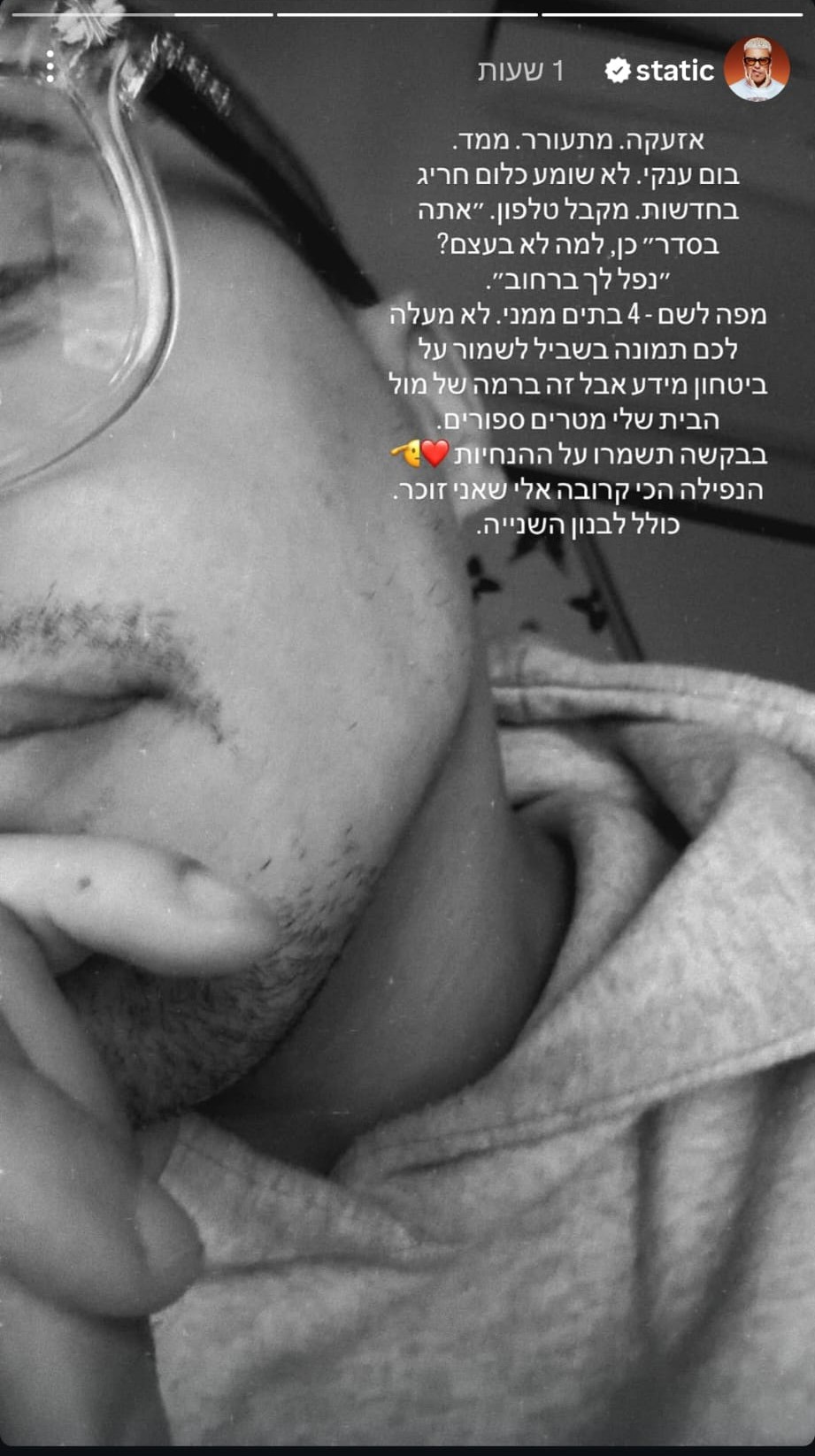 הזמר והמוזיקאי המצליח, לירז "סטטיק" רוסו, חשף בסטורי שהעלה לעמוד האינסטגרם שלו כי טיל פגע ממש סמוך למקום מגוריו.