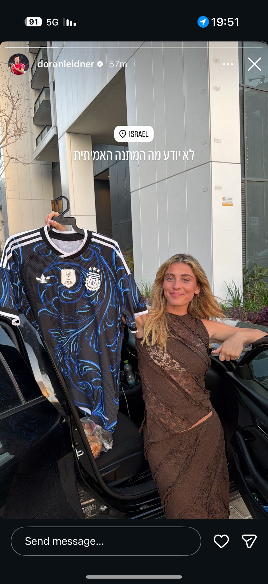 "לא יודע מה המתנה האמיתית", כתב ליידנר בסטורי וצילם את בת זוגו יחד עם החולצה החדשה של נבחרת ארגנטינה.