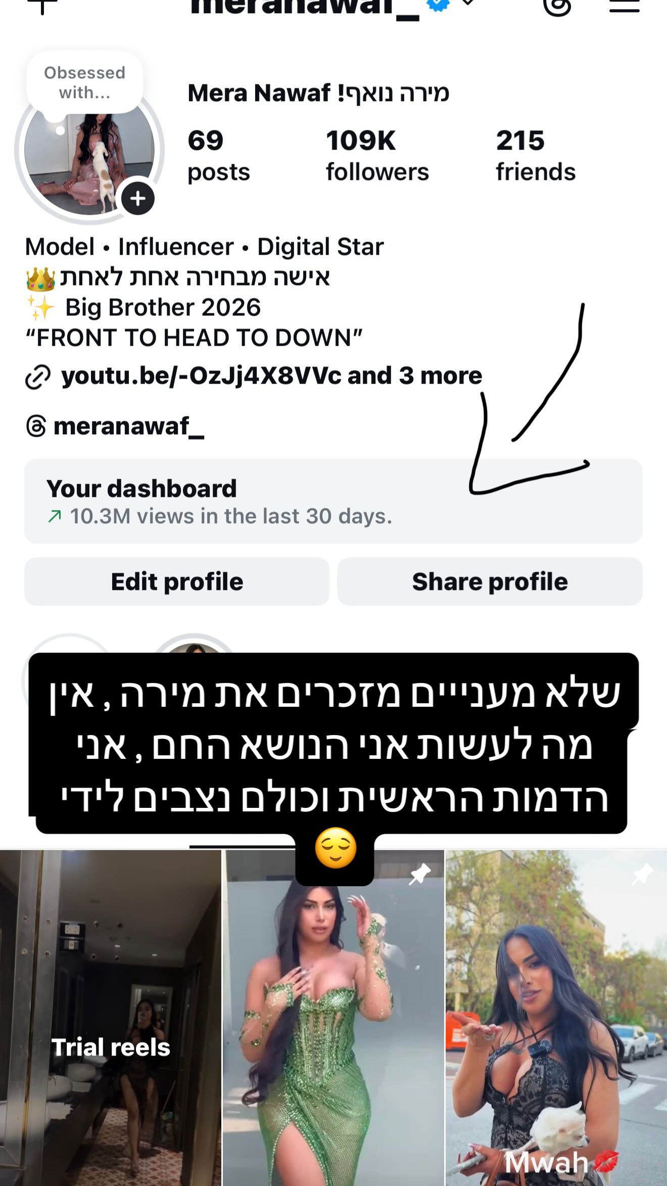 נואף הוסיפה תיעוד של החשיפה המסיבית לה חשבון האינסטגרם שלה זוכה בחודש האחרון, כ-10 מיליון ציפיות במצטבר, ורשמה: "אין מה לעשות אני הנושא החם, אני הדמות הראשית וכולם ניצבים לידי".