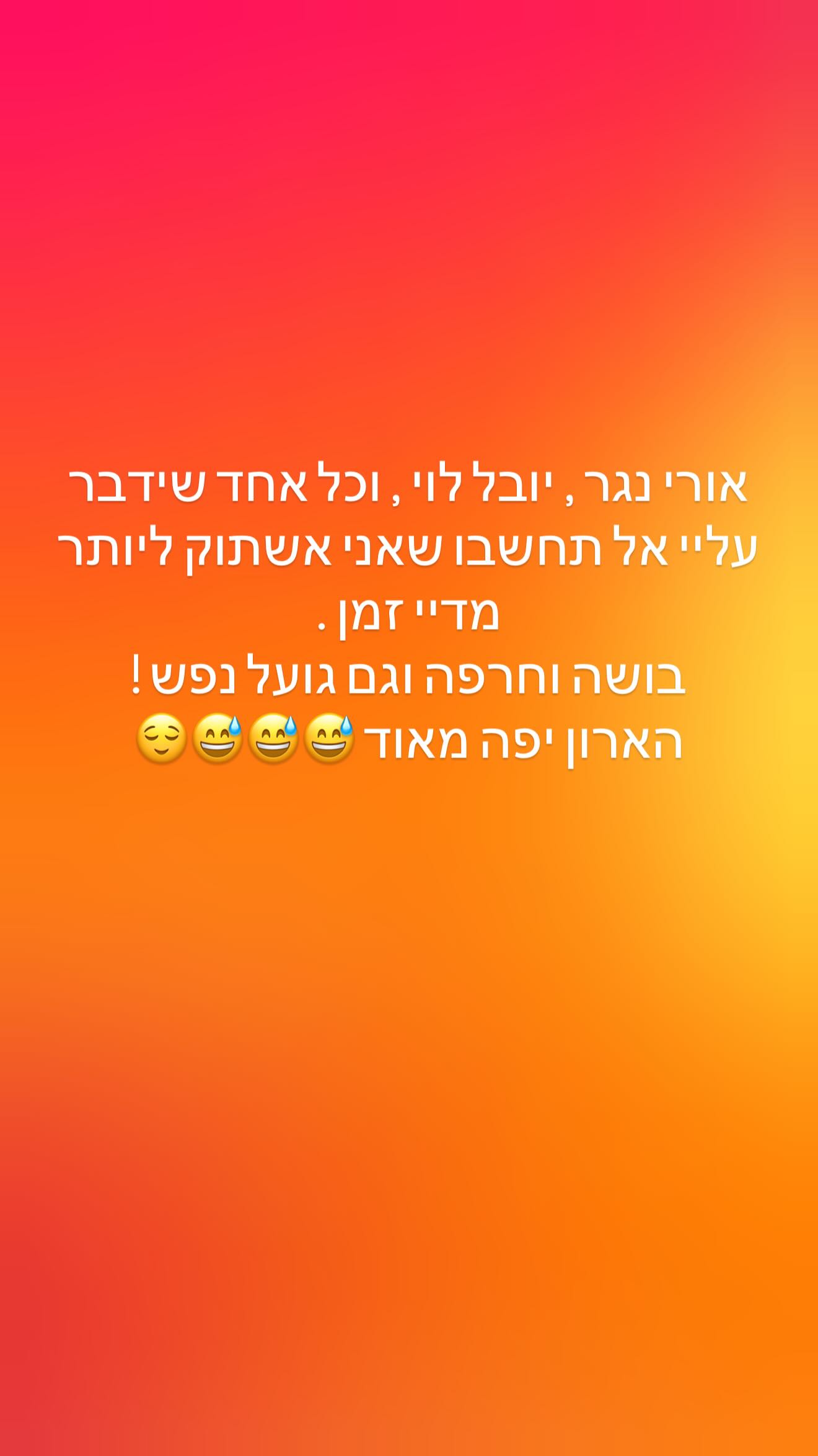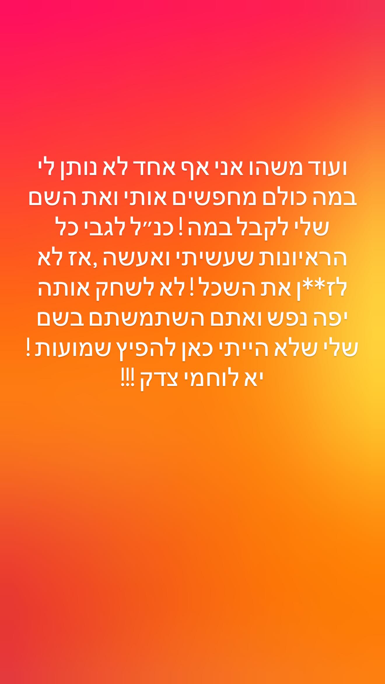 נואף ממשיכה: "ועוד משהו, אף אחד לא נותן לי במה כולם מחפשים אותי ואת השם שלי כדי לקבל במה. כנ"ל לגבי כל הראיונות שעשיתי ואעשה, אז לא לז**ן את השכל! לא לשחק אותה יפי נפש כשהשתמשתם בשם שלי שלא הייתי כאן להפיץ שמועות, יא לוחמי צדק!".