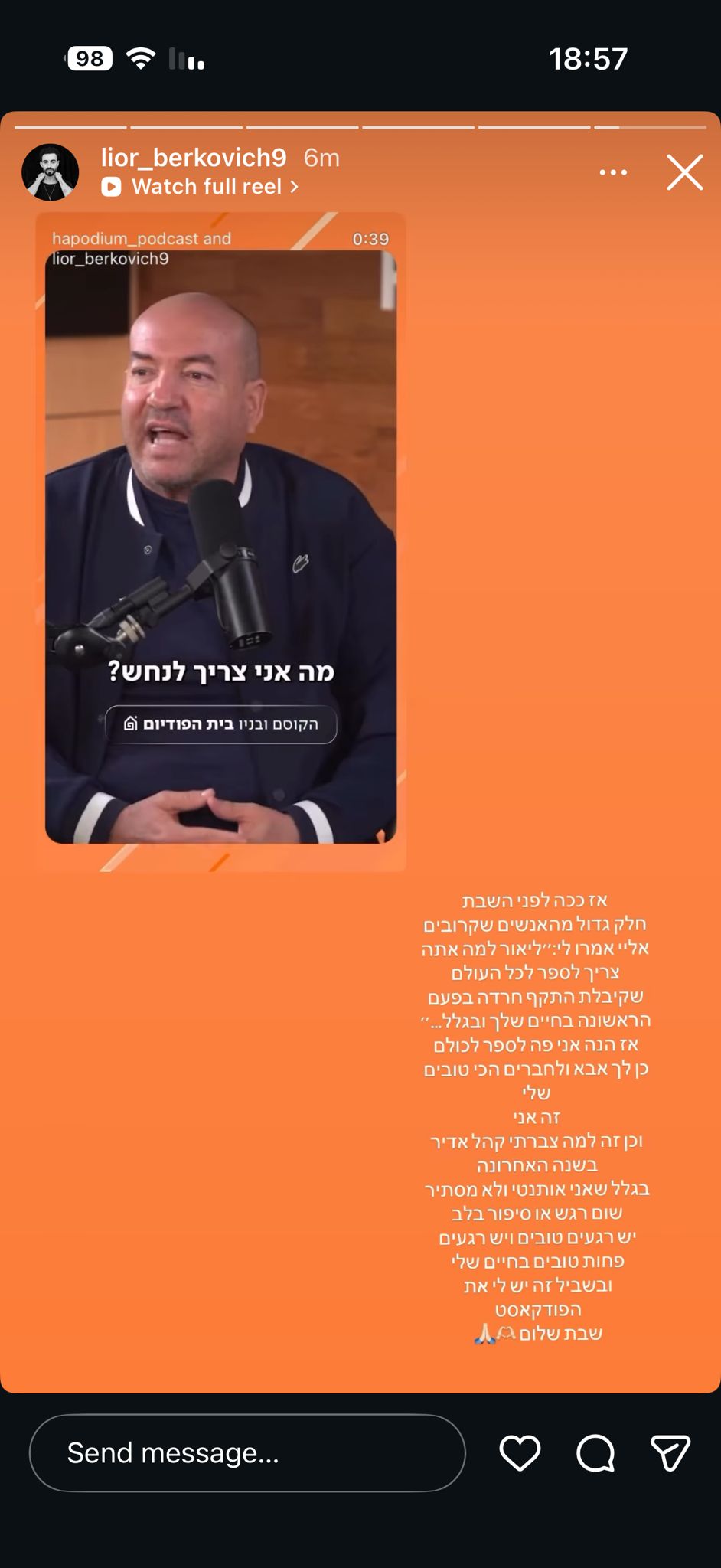 "אז הנה אני פה לספר לכולם - כן, לך אבא ולחברים הכי טובים שלי - זה אני. וכן, זה למה צברתי קהל אדיר בשנה האחרונה, בגלל שאני אותנטי ולא מסתיר שום רגש או סיפור בלב. יש רגעים טובים ויש רגעים פחות טובים בחיים שלי, ובשביל זה יש לי את הפודקאסט. שבת שלום".