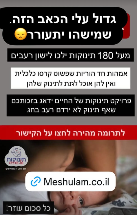 מאיה בוסקילה שיתפה קמפיין של עמותת "תינוקות של החיים", שפועלת לסיוע לאימהות מעוטות יכולת במזון ודברים שונים. "זה גדול עליי, הכאב שזה עושה. מדינה במצוקה. שמישהו יתעורר", בוסקילה רשמה.