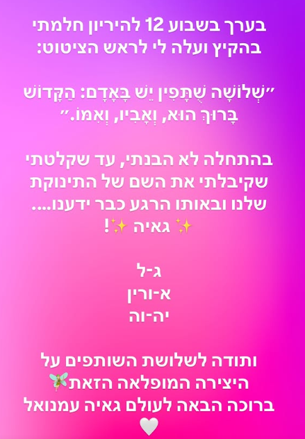 דוגמנית הנשק אורין ג'ולי הביאה לעולם בת בכורה לפני כשבוע. היום (ראשון), היא חושפת שהחליטה לקרוא לביתה גאיה - כראשי התיבות בין שלושת השמות - גל (בעלה), אורין, והקב"ה.