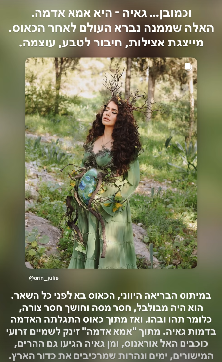 ג'ולי ממשיכה ומספרת על ההקשר למיתולוגיה היוונית: "גאיה היא אמא אדמה, האלה שממנה נברא העולם לאחר הכאוס. מייצגת אצילות, חיבור לטבע, עוצמה. במיתוס הבריאה היווני, הכאוס בא לפני כל השאר. הוא היה מבולבל, חסה מסה וחושך חסר צורה, כלומר תהו ובהו".