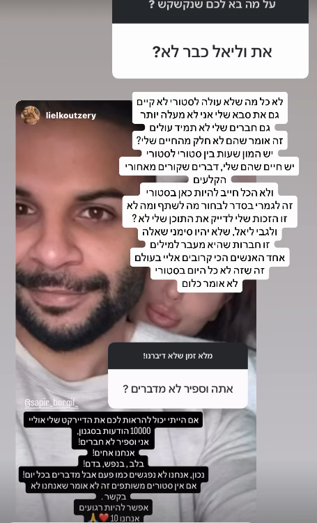 היא נותנת תשובה חד משמעית: "ולגבי ליאל, שלא יהיו סימני שאלה - זו חברות שהיא מעבר למילים. אחד האנשים הכי קרובים אליי בעולם. זה שזה לא כל היום בסטורי, לא אומר כלום". גם קוצרי התייחס ורשם: "אני וספיר אחים! בלב, בנפש, בדם".