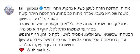 על ההחלטה שקיבלה: "הבטחתי שכשגיא ישוב אלינו, אפסיק לעשן, לקח לי זמן, הגוף והנפש עדיין בטראומה אבל אחרי 33 שנים אני ביום השלישי ללא עישון! נחישות, כח רצון ובעיקר החלטה. Wish me luck!".