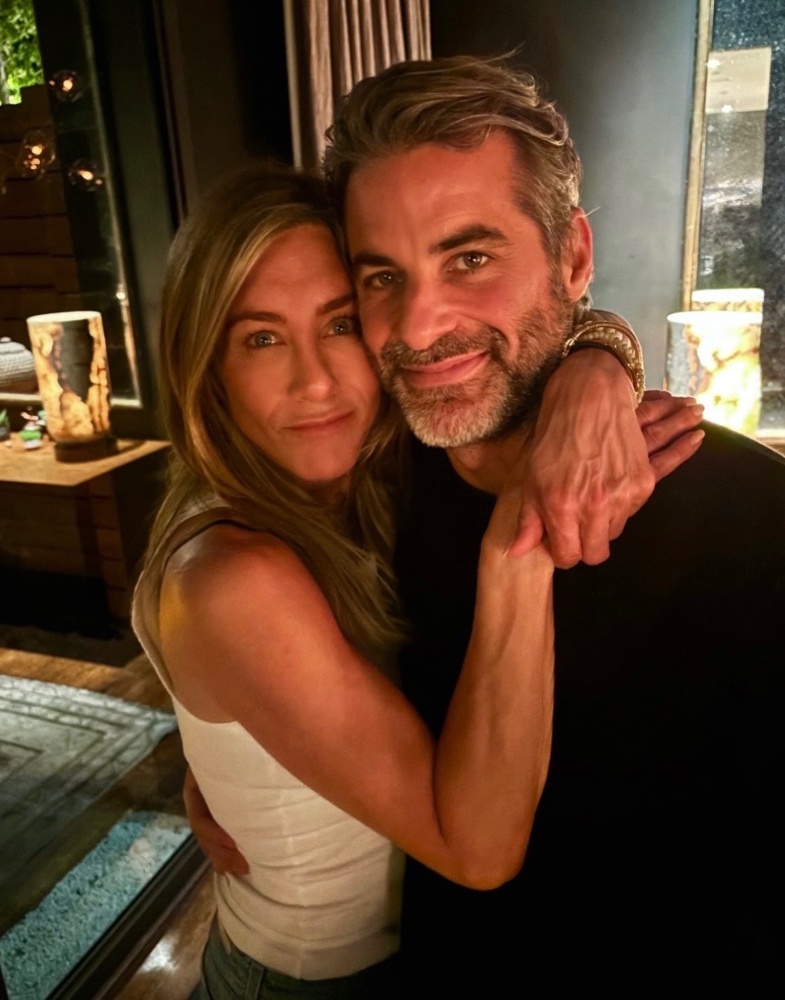 בפוסט היו 2 תמונות עם הבויפרינד קרטיס. הראשונה הייתה סלפי זוגי של השניים בו אניסטון מחבקת אותו סביב צווארו. בתמונה השניה, נראה קרטיס כשהוא מתלטף עם אחד מכלביה של הכוכבת.