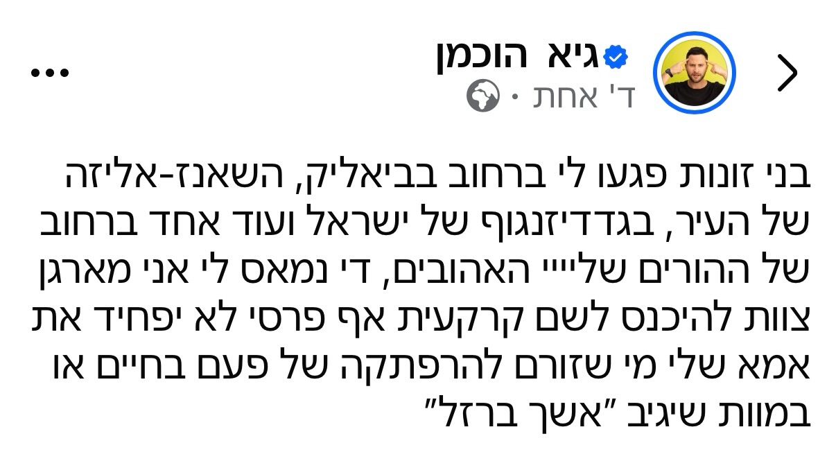הקומיקאי והסדנטאפיסט גיא הוכמן, העלה פוסט חצי הומוריסטי וחצי זועם שבו הוא קורא לציבור להצטרף אליו למאבק נגד האיראניים. "התפקדו אליי", כתב.