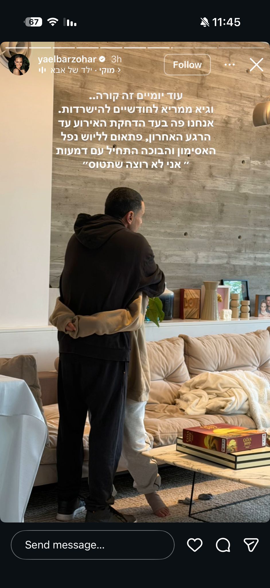 "עוד יומיים זה קורה", כתב בסטורי בחשבון האינסטגרם שלה. "גיא ממריא לחודשיים להישרדות. אנחנו פה בעד הדחקת האירוע עד הרגע האחרון, פתאום לליוש נפל האסימון והבוכה התחיל עם דמעות 'אני לא רוצה שתטוס". בשבוע שעבר, בר זוהר העלתה תמונה לסטורי וכתבה: "מנצלים רגעים אחרונים לפני שגיא ממריא שוב להישרדות".