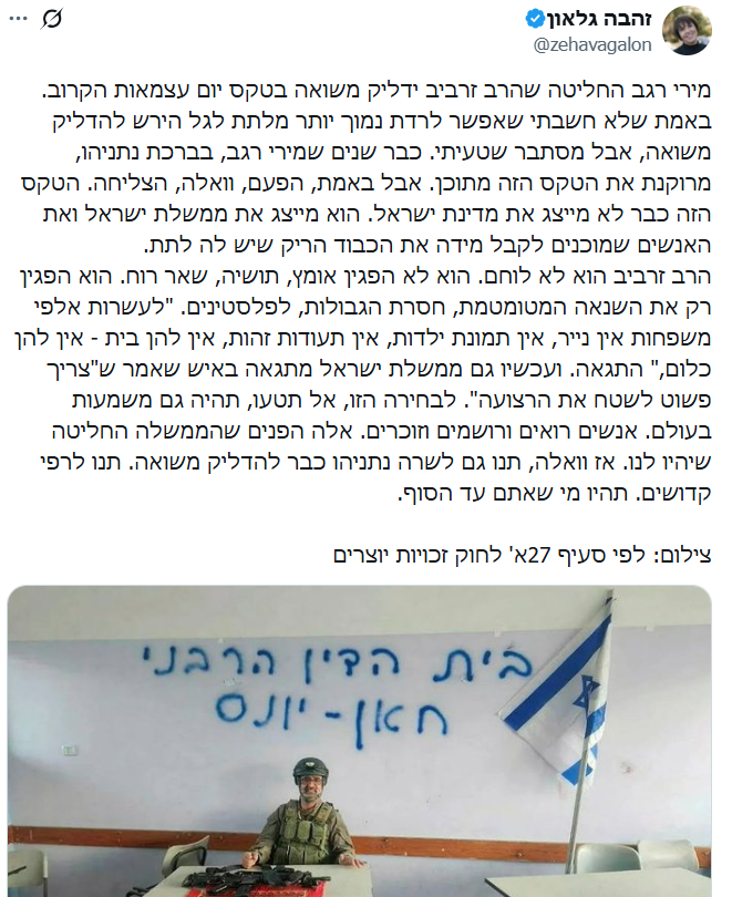 יושבת ראש מפלגת מרצ לשעבר, זהבה גלאון, הגיבה בציוץ שהעלתה לעמוד ה-X שלה לאנשים שנבחרו להשיא משואה בטקס השנה. היא ביקרה את התנהלותה של מירי רגב האמונה על הטקס. בדבריה היא התייחסה לבחירתו הספציפית של הרב אברהם זרביב וכתבה: "הוא לא לוחם. הוא לא הפגין אומץ, תושיה, שאר רוח".