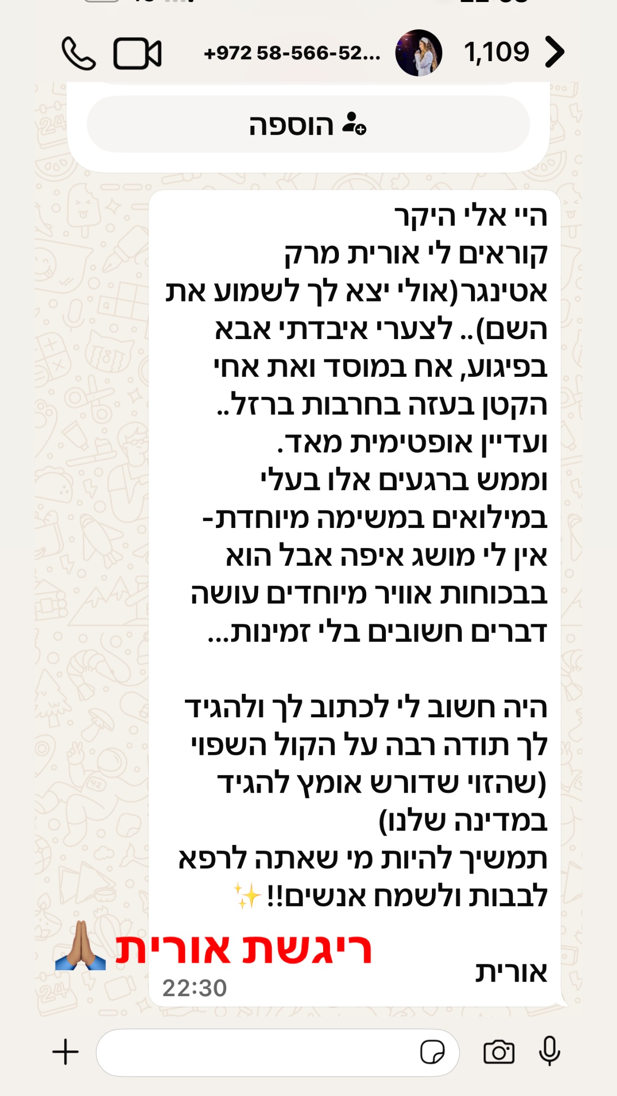 ״היי אלי היקר, קוראים לי אורית מרק אטינגר (אולי יצא לך לשמוע את השם). לצערי איבדתי אבא בפיגוע, אח במוסד ואת אחי הקטן בעזה ב'חרבות ברזל'... ועדיין אופטימית מאוד. ממש ברגעים אלו בעלי במילואים במשימה מיוחדת - אין לי מושג איפה אבל הוא בביטחון אוויר, עושה דברים חשובים בלי זמינות. היה חשוב לי לכתוב לך ולהגיד לך תודה רבה על הקול השפוי (שהזוי שדורש אומץ להגיד במדינה שלנו). תמשיך להיות מי שאתה, לרפא לבבות ולשמח אנשים", כך כתבה.