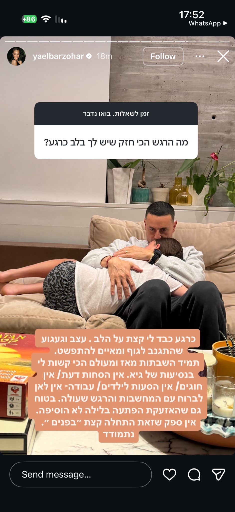 "כרגע כבד לי קצת על הלב. עצב וגעגוע שהתגנב לגוף ומאיים להתפשט", כתבה בר זוהר והמשיכה: "תמיד השבתות מאז ומעולם הכי קשות לי בנסיעות של גיא. אין הסחות דעת/ אין חוגים/ אין הסעות לילדים/ עבודה- אין לאן לברוח עם המחשבות והרגש שעולה. בטוח גם שאזעקת הפתעה בלילה לא הוסיפה. אין ספק שזאת התחלה קצת ״בפנים. נתמודד".