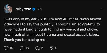 בציוץ נוסף, הוסיפה השחקנית ורשמה: "הייתי רק בתחילת שנות העשרים שלי. עכשיו אני בת 40. לקח לי כמעט שני עשורים לומר את זה בפומבי. למרות שאני כל כך אסירת תודה על כך ששרדתי מספיק זמן כדי למצוא את הקול שלי, זה רק מראה עד כמה עמוקה ההשפעה של טראומה ותקיפה מינית. תודה שראיתם אותי."
