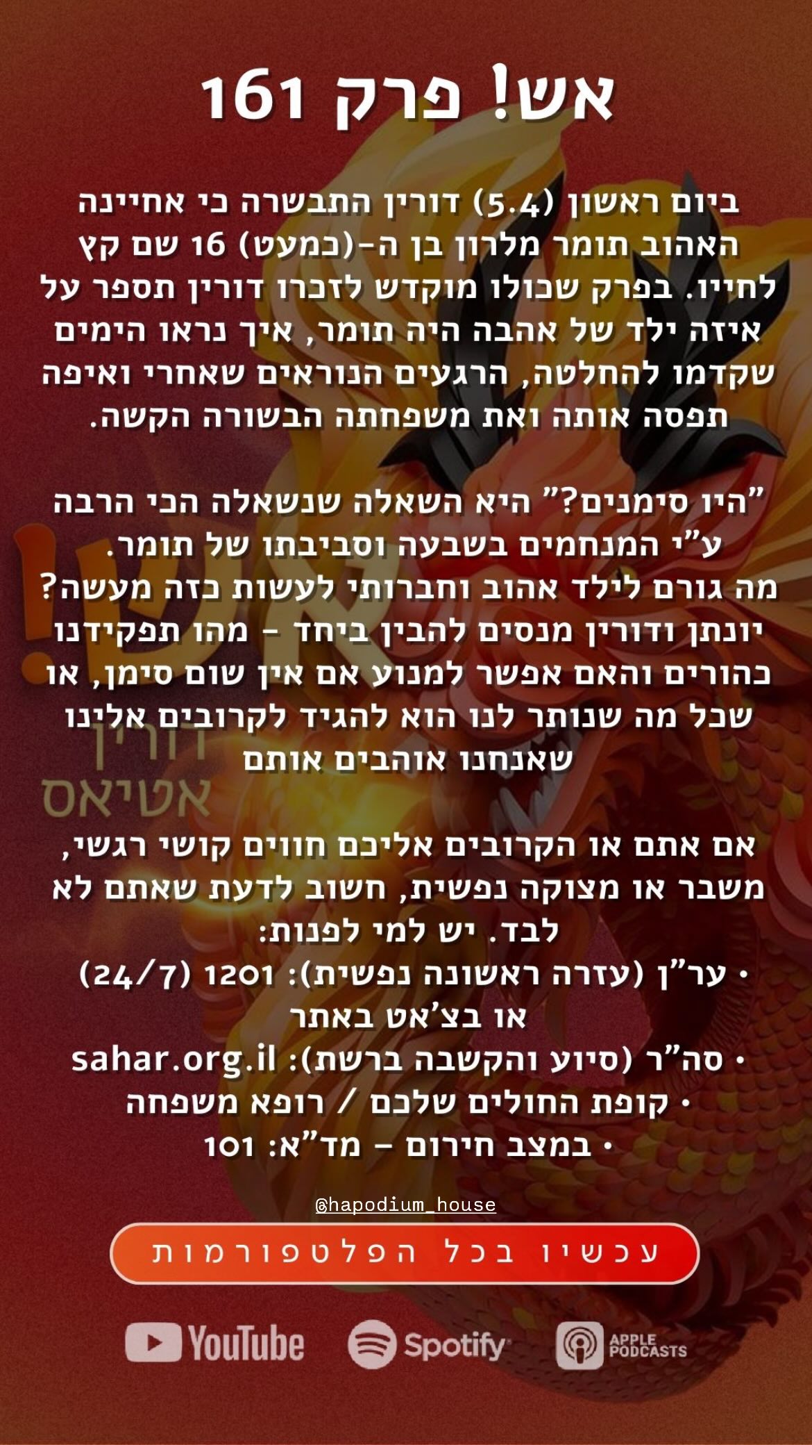 לאחר מכן, שיתפה חשבון האינסטגרם שלה הסבר על הפרק שלה בפודקאסט "אש!" מבית "הפודיום". "ביום ראשון (5.4) דורין התבשרה כי אחיינה האהוב תומר מלרון בן ה-(כמעט) 16 שם קץ לחייו. בפרק שכולו מוקדש לזכרו דורין תספר על איזה ילד של אהבה היה תומר, איך נראו הימים שקדמו להחלטה, הרגעים הנוראים שאחרי ואיפה תפסה אותה ואת משפחתה הבשורה הקשה", נכתב.