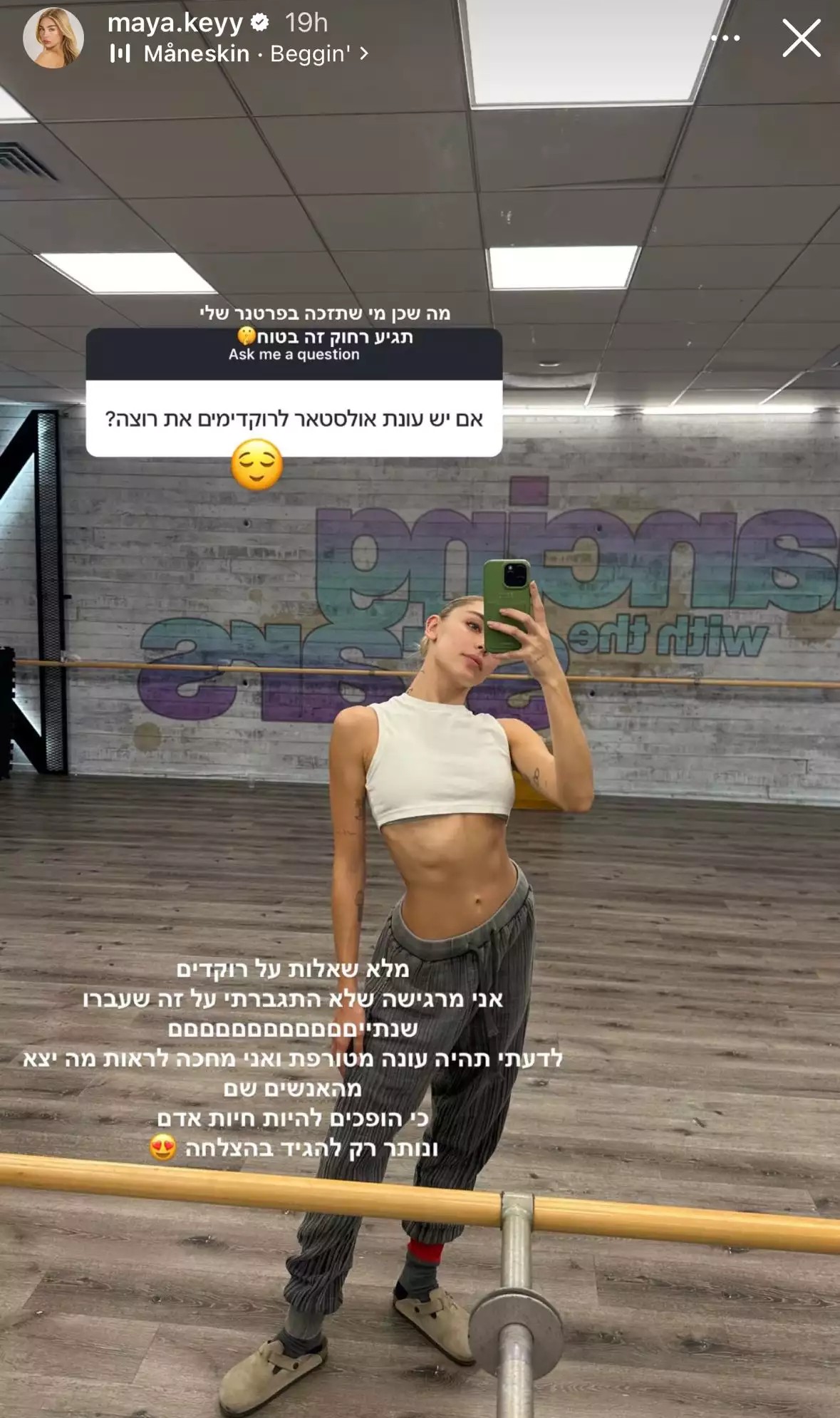 בהמשך הסטורי היא נתנה את תשובתה לשאלה וכתבה: "מלא שאלות על רוקדים אני מרגישה שלא התבגרתי על זה שעברו שנתיים!!!". היא המשיכה ותיארה מה היא חושבת שיהיה אם בכלל תהיה עונת אולסטאר לרוקדים עם כוכבים: "לדעתי תהיה עונה מטורפת ואני מחכה לראות מה יצא מהאנשים שם".