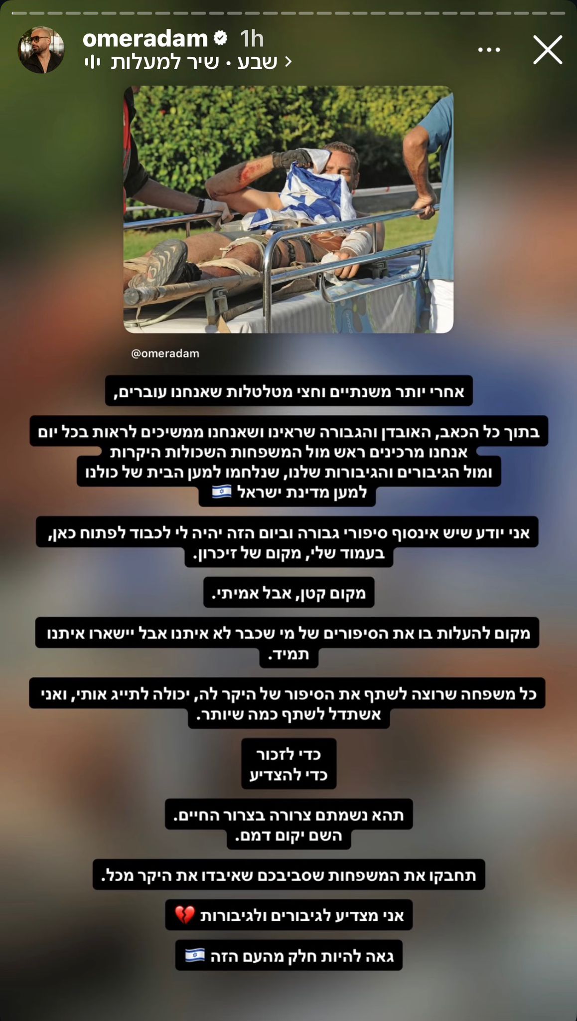 בסטורי שפרסם עומר אדם בשעות האחרונות, כתב: "אחרי יותר משנתיים וחצי מטלטלות שאנחנו עוברים, בתוך כל הכאב, האובדן והגבורה שראינו ושאנחנו ממשיכים לראות בכל יום אנחנו מרכינים ראש מול המשפחות השכולות היקרות ומול הגיבורים והגיבורות שלנו, שנלחמו למען הבית של כולנו למען מדינת ישראל".