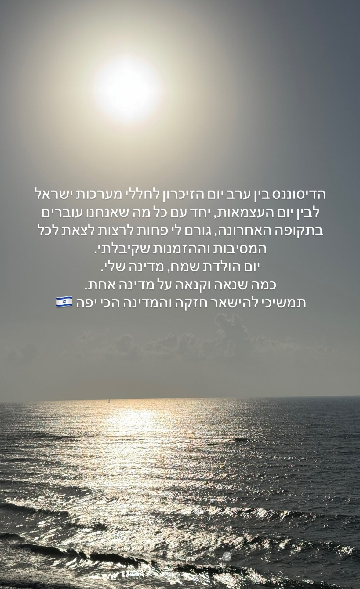 לסיכום התחושות היא בירכה במזל טוב את מדינת ישראל וכתבה: "יום הולדת שמח, מדינה שלי". והמשיכה: "כמה שנאה וקנאה על מדינה אחת. תמשיכי להישאר חזקה והמדינה הכי יפה".