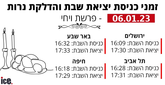 רגע לפני שהשבת נכנסת, ice עושה לכם סדר, כמדי שבוע בזמני כניסת יציאת שבת והדלקת נרות. והשבוע, פרשת 'ויחי' לשבת של ה-6.1.23 עד מוצאי שבת ב-7.1.23. וגם: מה מזג האוויר הצפוי לסוף השבוע?